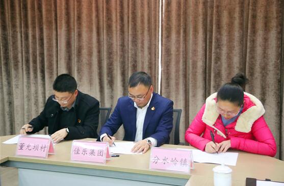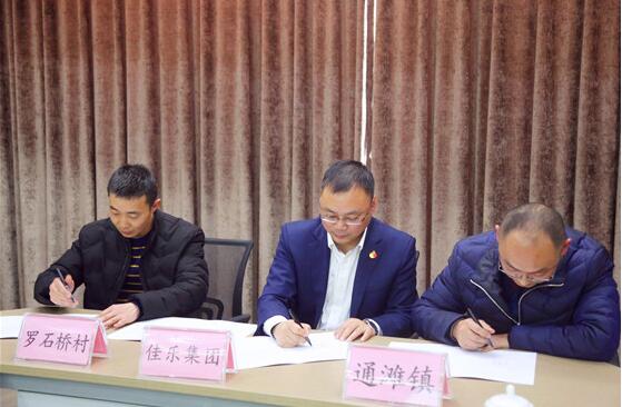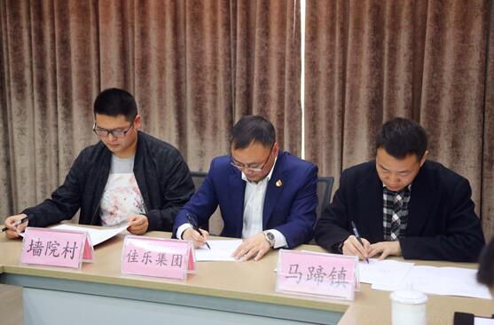 ?? 签约仪式上,佳乐集团党委副书记、副总裁贺军分别和三个贫困村及所在乡镇党(工)委代表签订三方结对共建协议书。